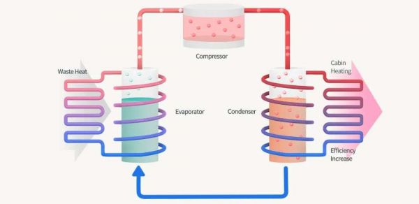 比如可以吸收汽车电子部件热量,从而降低冬季电量消耗的的热泵空调: