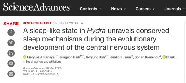 韩国和日本的一个研究小组的研究表明,水螅会周期性地进入休息状态,这一状态符合睡眠的基本标准。