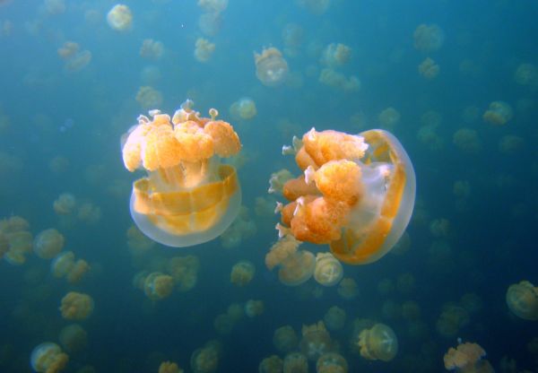仙后水母,大约4英寸长,大部分时间都是上下颠倒的,触角伸向海面,搏动着把海水推进它们的身体。