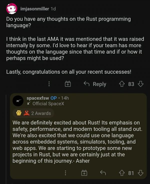 其中,有一名用户“imjasonmiller”提问了SpaceX软件开发团队对Rust的看法。据了解,在SpaceX软件开发团队上次发起的AMA活动中,该团队就曾被问及类似的问题,但是当时团队并未使用Rust语言开发程序,只是在内部讨论中会有所提及。