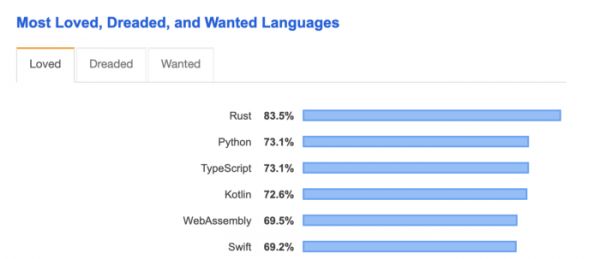 据Stack Overflow数据,在开发者「最受喜爱编程语言」评选中,Rust连续4年登顶。这项调查结果反映了将近6万5千名开发人员的意见与经验。