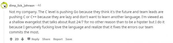 @dimp_lick_johnson:“C 语言开发者推动Go语言是因为他们认为Go是未来,而团队领导推动C或者C++是因为他们懒惰,而我被视为一个肤浅的跟风者,每天都在谈论Rust,被认为只是为了跟随流行,但我这么做是因为我真的很喜欢这门语言,并且意识到它能够修复我们团队所犯的最多的错误。”