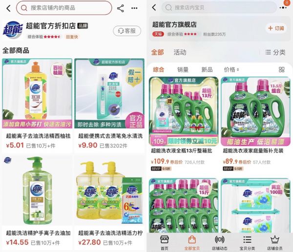 以淘特的超能官方折扣店和天猫的超能官方旗舰店为例进行对比,淘特店的商品数量少于天猫店,同款商品定价也更低,例如119.9元的洗衣凝珠在淘特的定价仅为49.9元。而且,与天猫店动辄十几斤上百元的量贩套装相比,淘特店的商品套装体量普遍较小,价格也均在50元以下。
