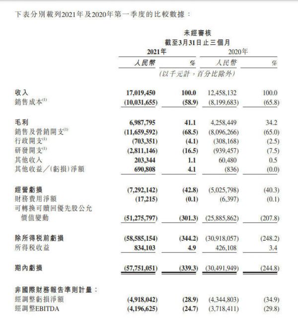 得益于收入结构的变化,快手的毛利率由2020年同期的34.2%提升至41.1%。排除以股份为基础的薪酬开支、可转换可赎回优先股公允价值变动等因素影响,一季度,快手经调整后的净亏损为49亿元,经调整净亏损率为28.9%,较2020年同期的34.9%有所降低。