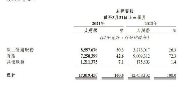 直播:直播业务收入由2020年同期的人民币90亿元减少19.5%至2021年第一季度的人民币73亿元,主要是由于直播平均月付费用户由2020年同期的6700万变为2021年第一季度的5240万。