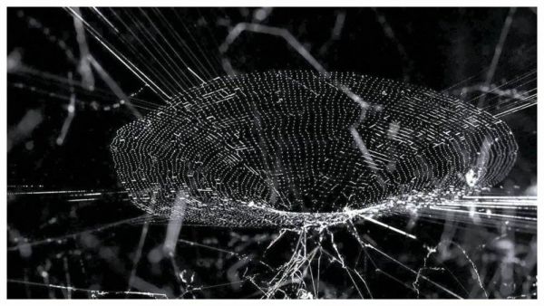 这张图片中缠绕的网是由不同种类的蜘蛛编织而成的。它来自Arachnophilia,一个由柏林艺术家托马斯·萨拉切诺(Tomás Saraceno)发起的跨学科研究项目,研究蜘蛛网结构、振动信号等等。萨拉切诺开发了一种扫描仪,将蜘蛛网数字化,并记录下了蜘蛛网振动的声音。
