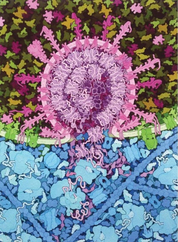 古德塞尔描绘了冠状病毒的生命周期、流感疫苗、脂滴和其他主题。他将现有的知识与有根据的猜测结合起来,旨在扩展科学家的直觉和理解。这些画包含了许多近似和决策。例如,SARS-CoV-2刺突蛋白在引导病毒与细胞融合的过程中发生了复杂的构象变化。