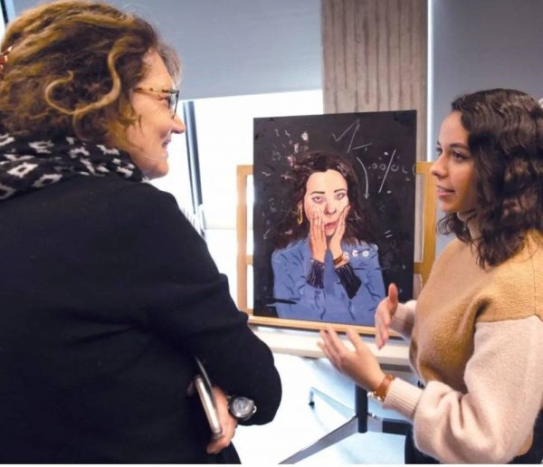 图9. 苏珊娜·布朗(Suzanne Brown,右)与耶鲁大学艺术馆馆长斯蒂芬妮·怀尔斯(Stephanie Wiles)讨论她的画作《dis,oRdered》。这幅自画像探讨了熵、热传递和时间,并将其与日常生活中的混乱和压力进行了类比。布朗于2019年在本科课程《物理学与艺术》中画了这幅画,该课程由来自普拉特学院的耶鲁大学物理系客座教授阿格涅斯·莫西(Ágnes Mócsy)教授。