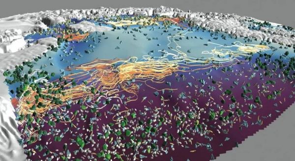 为了描绘南极冰架下水域的模拟,萨姆塞尔引入了基于手工雕刻形式的示踪剂。纹理、形状和阴影不同的示踪剂使观察者能够区分多个变量——温度、盐度、水流、水深等。与用彩色球体表示变量相比,这样的图像更容易理解。在虚拟现实中,科学家可以游近或缩小,从一系列角度研究数据。萨姆塞尔说:“我们的目标是没有噪声的复杂环境,一个平静、清晰的视觉线索环境。”
