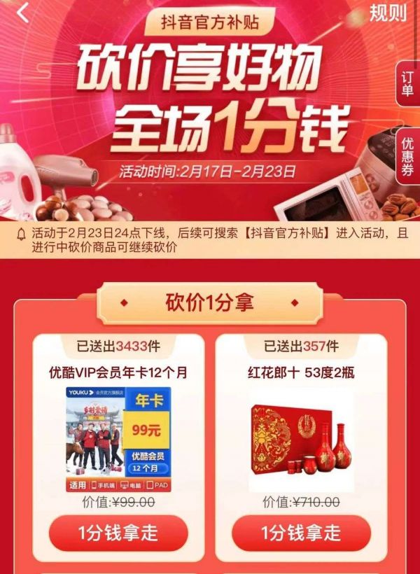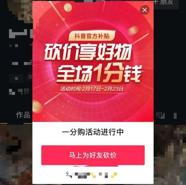 早在2021年之初,抖音“兴趣电商”概念尚未提出之时,抖音就开放了“砍一刀”活动,但没有全面铺开,只是通过部分限时活动,在较小的范围内尝试砍一刀玩法。