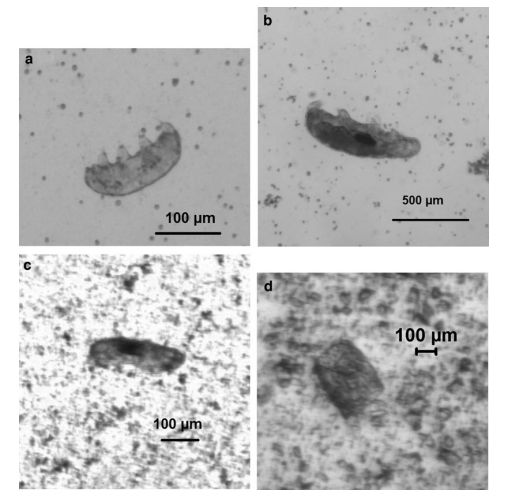实验中的一些水熊虫。(a)(b)为实验前的水熊虫。(c)展示了在每秒728米的撞击实验后存活下来的水熊虫。(d)为每秒901米的撞击实验后留下的水熊虫碎片。| 图片来源:Traspas, A. & Burchell, M. J. / Astrobiology (2021)