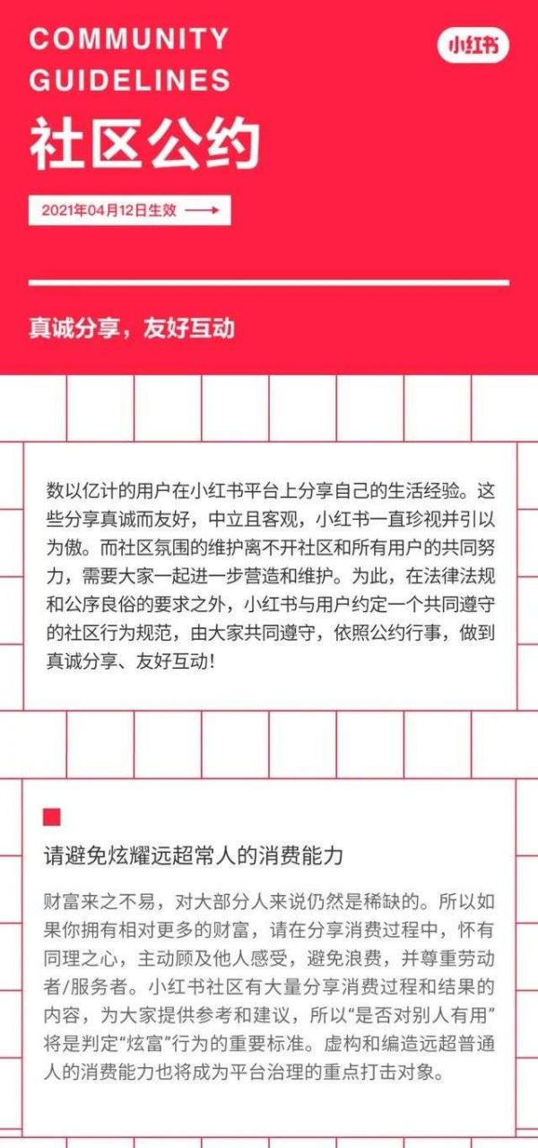2021年4月,官媒《人民日报》点名批评炫富博主。两天后,小红书薯队长宣布《社区公约》上线,公约中明确标明“请避免炫耀远超常人的消费能力”,提倡社区价值观——“真诚分享、友好互动”。