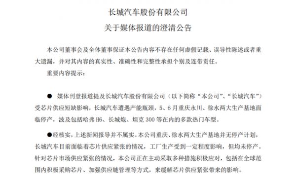 4月底,自主品牌的头部企业之一的长城汽车,也陷入芯片短缺的停产风波中。虽然随后不久,长城汽车就发布澄清公告。但在这份公告中,长城也表示芯片短缺已对产能造成影响:“目前面临芯片供应紧张影响,工厂生产受到一定程度的影响”。