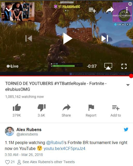 在2019年的时候,网飞便曾表现出一种担忧:我们的最大对手不是HBO而是《堡垒之夜》。2018年,根据外媒eurogamer报道,油管西班牙语主播elrubiusOMG的一次直播共吸引了超过110万名观众观看,而这其中还有一部分观众是通过自己的频道进行观看而没有被统计在内,这也就意味着实际人数要比这个还多。