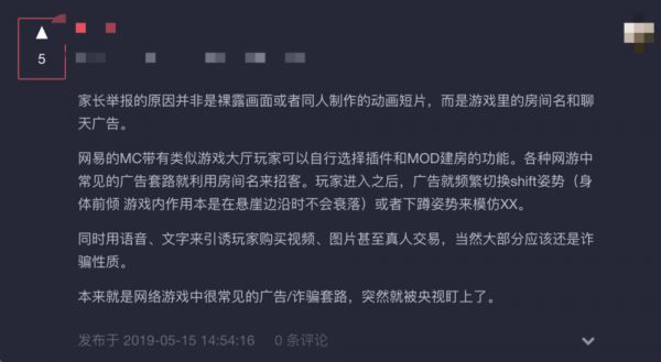 2019 年 5 月 7 日,央视报道网络游戏《我的世界》中,部分用户利用游戏各项功能发布涉黄信息,被众多家长举报。
