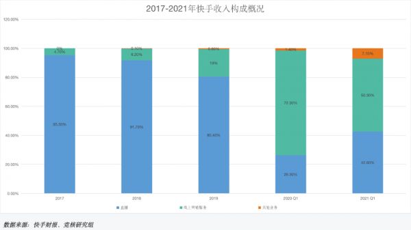 2021年Q1,快手线上营销业务收入为85.58亿元,占总营收50.3%,与去年同期相比增长161.5%。另外,直播业务营收为72.5亿元,占总营收42.6%,同比下降19.5%。