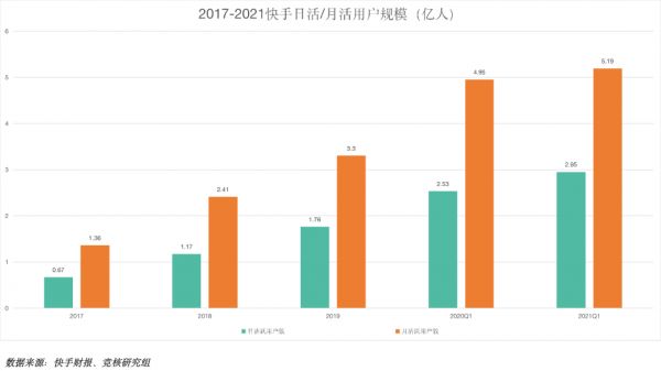 根据财报显示,2021年第一季度中,快手中国应用程序以及小程序平均日活跃用户达3.792亿,同比增长26.4%,平均月活跃用户达5.198亿。