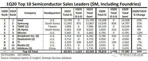 最前线丨全球十大半导体厂商销售额榜单出炉:英特尔居首,海思入围