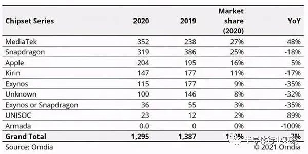 市场调研机构Omdia在早前发布的报告中表示,2020年,联发科智能手机芯片的出货量达到了3.518亿,较2019年提升了47.8%,市场份额从去年的17.2%跃升至27.2%。这也帮助他们超越高通,成为全球最大的智能手机芯片供应商。公司全球排名也跃居前十。