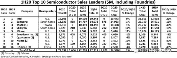 如上图所示,根据ICinsgihts的统计,华为海思在1H20的同比销售额增长了49%,这也使其成为第一家在全球排名前10位的中国半导体供应商。