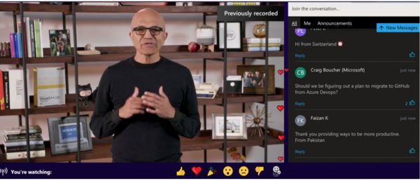 但在会议形式的设计上,微软此次的互动性和趣味性明显更强了。观众可以随时在下方点赞、比心或者踩一踩,也可以在右边跟随着直播发表评论,与世界各地正在观看的其他观众交流互动。