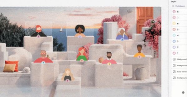 此外,Teams还给会议的Together模式添加了更多的可扩展性,就是给会议系统加入了更多自定义功能,让开发者可以为Teams会议创建和共享自己的自定义场景,让线上会议更具吸引力以及更具个性化。比如像下边这样,让会议氛围变得更轻松有趣。