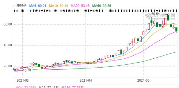 暴涨的除了销量,还有小康股份的股价。今年四月以来,小康股份从22元涨到最高69元。
