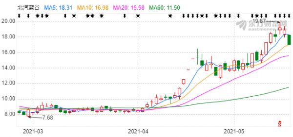 以北汽蓝谷为例,在今年4月12日的华为分析师大会上,华为轮值董事长徐直军宣布,已经与包括北汽在内的三家车企合作,将推出三个品牌的智能汽车。北汽蓝谷接下来8个交易日收获三个涨停,期间累涨超过50%。