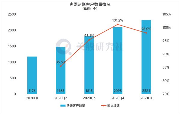 首先是声网的活跃用户数量在继续上涨,Q1声网活跃用户数量达到2324(音视频服务业务用户,不包括1月收购的Easemob用户),去年同期活跃客户数量为1176,同比增长97.6%。
