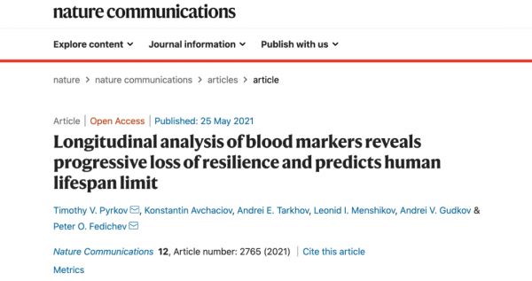 该研究以 “Longitudinal analysis of blood markers reveals progressive loss of resilience and predicts human lifespan limit” 为题,发表在最新一期的 Nature Communication 杂志上。来自新加坡 Gero 生物科技公司的 Timothy V. Pyrkov 博士为本研究的通讯作者。