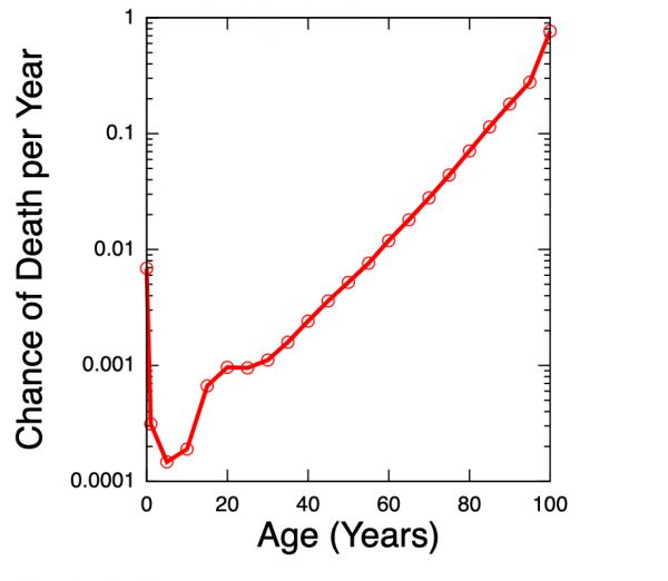 在时序年龄中,有一个经典的 Gompertzian 死亡率定律。这一定律是由 19 世纪一位英国保险统计师发现的,他发现人类的死亡率有一个非常有趣的规律:婴儿期死亡率较高,随后持续下降,10-15 岁人类死亡率达到最低点,随后便呈指数增长,大约每 8 年翻一倍,持续至 80 岁。但从生物学年龄的角度来评估,人类的死亡风险其实是远低于 Gompertzian 死亡率定律的。