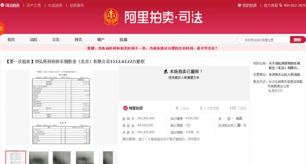 新京报讯(记者 陆一夫)5月7日,淘宝司法平台挂出湖南省长沙市天心区人民法院拍卖公告。公告显示,原乐视网副董事长刘弘所持的乐视影业(北京)有限公司(下称乐视影业)1512.6122万股权将于今年5月30日至31日被公开拍卖。但目前这一拍卖已被撤回,淘宝司法平台显示“优先竞买人申请提交中”。