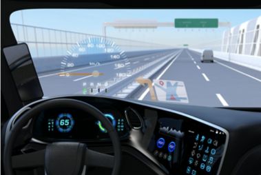 图:可拉伸弹力柔性屏可完全贴合汽车挡风玻璃的球面表面,与AR技术相结合后可直接显示导航信息
