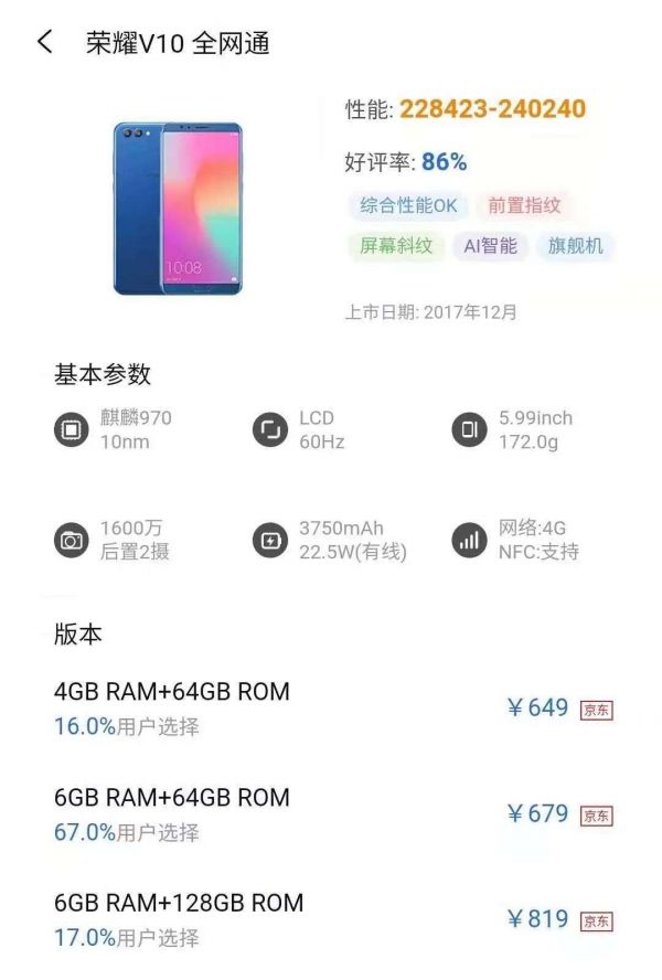 再例如荣耀V10手机,其所使用的是麒麟970芯片(性能优于酷派的Helio G80),其他配置与COOL 20配置类似的情况下,在京东售价也仅为650元左右,低于酷派的699元。