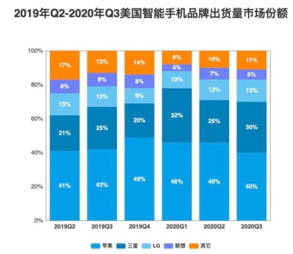 2019年Q1到2020年Q3美国手机市场出货变化,图源Couterpoint