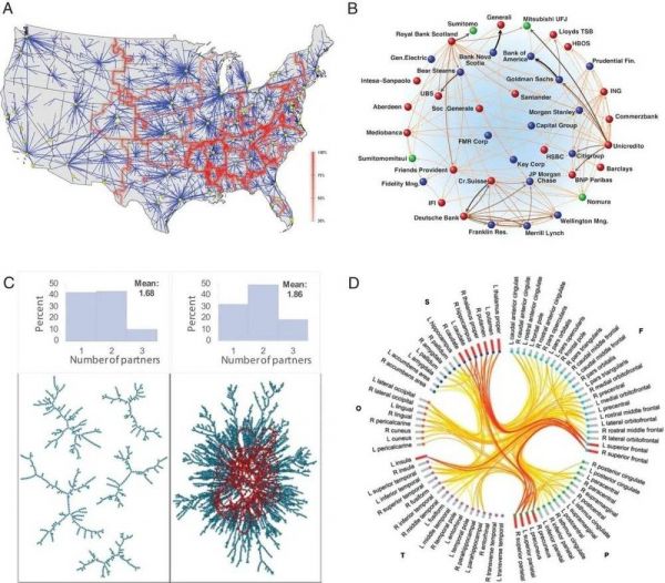 图2:(A)人流网络揭示了是重要节点(黄色)和有效边界(红色)的城市。(转载自参考文献20,CC BY 4.0)。(B)国际金融机构网络。边缘象征着相互持股。来自参考文献21,经AAAS许可转载。请注意,节点之间的高连接性可能导致系统性风险和网络漏洞。(C)性伙伴出现的分布对网络连接的影响。(改编自参考文献22,McGraw Hill LLC)。请注意,并发伙伴的平均数量略有增加(从左上方到右方的直方图)会对网络最大部分中的节点数量产生重大影响。(D)大脑区域网络,在此边缘代表着流线密度的发育增长。(转载自参考文献23,CC BY 4.0)。