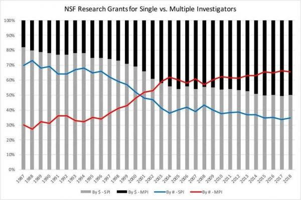 图1. 1987年至2018年,美国国家科学基金会(NSF)的单个研究者奖项(SPI)和多个研究者奖项(MPI)。请注意有一个以上的PI的奖项的趋势,NSF认为这是目前最好的对跨学科的代替数据(6)(数据来源:参考5和7)。