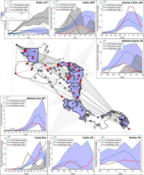 图4: 中美洲建模域(Center),其中包含一个由非活动节点(灰色圆圈),活动节点(红色圆圈)和每个活动节点之间的贩运路线(虚线)组成的模拟麻醉品贩运网络示例。模型域之外最南端和最北端的节点分别代表供应节点(例如哥伦比亚)和需求节点(例如墨西哥)。在外围地区,比较了在联合禁毒数据库(CCDB)部门管理级别报告的地区的可卡因装运量(地图中的蓝色区域)(红线),使用网络代理(蓝线)和不使用网络代理(黑线)的模型版本所模拟的中位数。阴影区域代表模拟可卡因体积的第二和第三四分位数的边界。被选择的部门在每个国家中至少包括一个地点,并且要基于CCDB报告的至少5年的连续观测结果。(转载自参考文献95,CC BY-NC-ND 4.0)