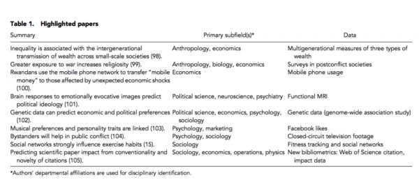 社会科学进入黄金时代的标志就在于爆炸性出现的新数据、分析方法与跨学科方法这三者的交汇。在我们面对世界时,这些因素对于解决更有挑战性的问题必不可少。在本文中我们讨论了如何发展一门“通用语言”来促进更多的跨学科研究,并提供两个案例(社交网络和行为经济)去论证这个议题。同时我们还提供了过去12年的一些示例性研究。最后,我们着眼于应对这些积极趋势带来的挑战,例如职业激励和寻求统一的框架,以及可以用于应对这些挑战的相关最佳做法。