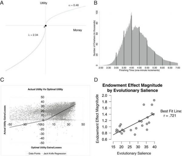 图3:损失厌恶。(A)收益/损失效用函数根据风险选择估算出的组参数得出的货币收益。转载自参考文献66,经运筹学和管理科学研究所许可。(B)马拉松比赛完成时间的分配。转载自参考文献67,经运营研究所和管理科学研究所许可,许可通过版权清除中心公司(Copyright Clearance Center)传达。请注意在整数处的峰值。(C)在一个50周期的节省实验中,以前每个时期的实际点值,与从消费选择中选择的最佳条件点值作图(以前未使用Brown等人的数据发表[68])。请注意,即使最佳点值(x轴)应为负数,实际点值(y轴)为负数的数量也很少。(D)人类捐赠效应(买卖价格比率)与24个项目的显着显着性相关(r = 0.72)(以前的研究中仅使用2个)。这一发现反映了行为经济学,进化心理学和文化人类学之间的贸易往来。转载自参考文献69,经Elsevier许可。