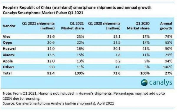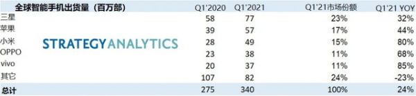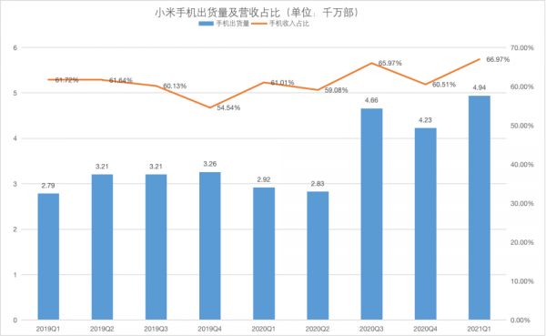 2021年Q1,小米手机继续排在全球第三,出货量 4940 万台,同比增长 69.1%。收入人民币 515 亿元,同比增长 69.8%。据 Canalys 统计,中国大陆地区智能手机出货量同比增长 74.6%。