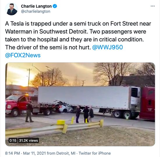 2019年3月1日,类似的事故再次发生,同样是在美国佛罗里达州,特斯拉Model 3在开启Autopilot的状态下撞上一辆白色厢式货车,驾驶员当场死亡。
