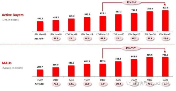 截至2021年3月31日,拼多多年度活跃买家数达到8.238亿,较上一年同期净增1.957亿。正式迈入8亿用户新时代。