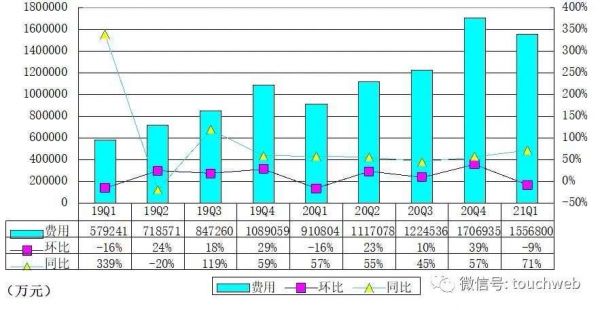 拼多多2021年第一季度整体运营开支为155.680亿元(约23.761亿美元),较上年同期的91.080亿元增长71%。