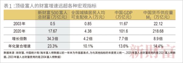 “新财富中国500富人榜”始于2003年,到2020年,500人财富总和从0.5万亿增加到17.67万亿,增长了34.3倍,年化复合增速23.3%。