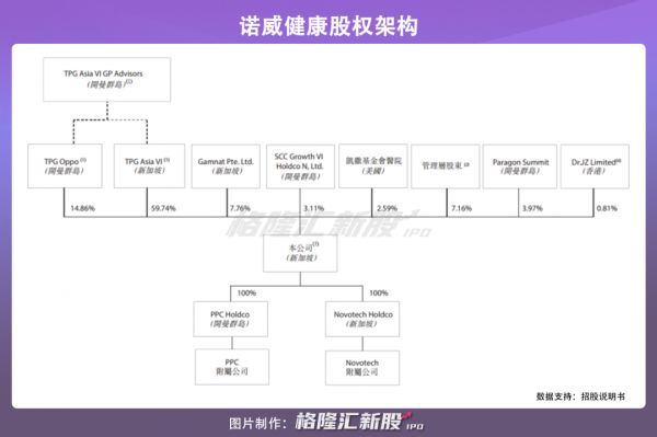 伴随着重组,诺威健康股权架构亦发生改变。TPG Asia VI GP Advisors作为其控股股东,透过TPG Oppo及TPG Asia VI合计控制其约74.60%的股份。除此之外,数十名管理层股东合计持有7.16%股份,红杉资本透过SCCG rowth持有3.11%的股份,Gamnat Pte、凯撒基金会医院、Paragon Summit也位列公司股东之中。