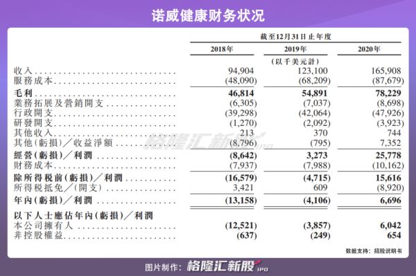 从财务状况来看,2018年-2020年诺威健康实现营收由9490.4万美元增至16590.8万美元,复合年增长率达32.2%。利润方面,公司2018年、2019年净亏损分别为1315.8万美元及410.6万美元,2020年的纯利为669.6万美元,整体呈现良好的发展态势。