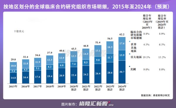 弗若斯特沙利文数据显示,全球临床合约研究组织市场规模以8.8%的复合年增长率由2015年的290亿美元增至至2019年的406亿美元,预计到2024年将达到622亿美元。其中,亚太地区增速明显,以19.1%的复合年增长率由34亿美元增至68亿美元,预计2024年达到139亿美元。