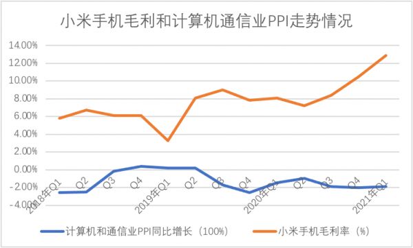 但2020年Q3之后,情况发生了很大变化, PPI仍处于低点,但小米手机毛利率表现却摆脱原有轨道,呈不断上扬的趋势,2021年Q1,手机毛利率达到了12.9%的新高。