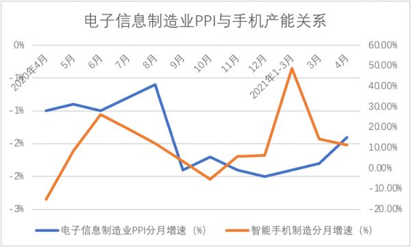 根据工信部数据,我们整理了2020年Q2至2021年4月全国电子信息制造业PPI与智能手机产能的关系,在上述略显杂乱的图表中,我们读到了以下规律: